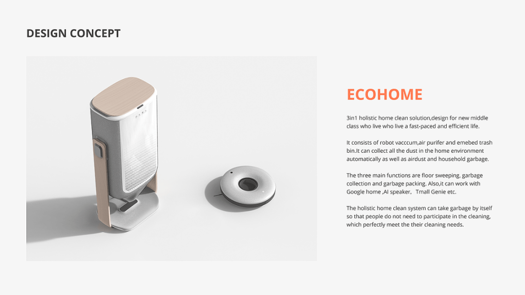 ECOHOME由機器人吸塵器、空氣凈化器和emembed垃圾桶組成。它可以自動收集家庭環境中的所有灰塵以及空氣灰塵和生活垃圾。